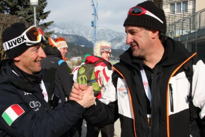 Ecco gli ‘angeli custodi’ di Nadia Fanchini, Gigi Parravvicini, allenatore fin dai tempi del Comitato Alpi Centrali, e lo skiman Dynastar Mauro Sbardellotto che affila lamine e prepara solette da sette anni.