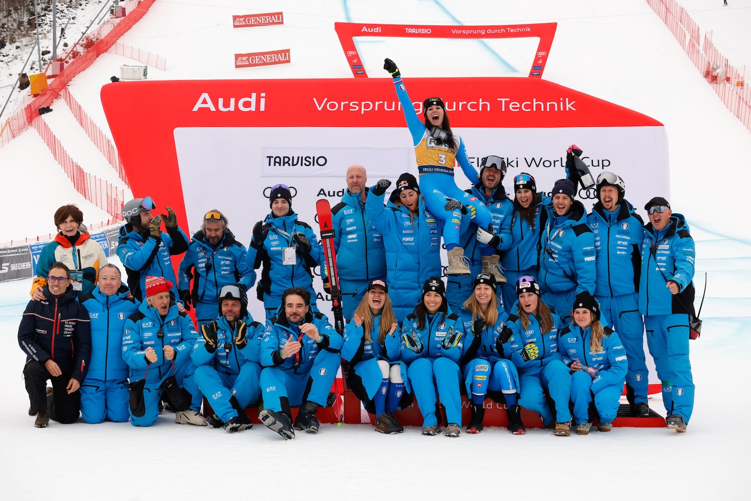 Domani è un altro giorno e i Giochi Olimpici non sembrano ancora essere così vicini. Oggi è il tempo di festeggiare. A Tarvisio sventola il tricolore, è festa azzurra e a sollevare sulle spalle Nicol c’è la capitana Sofia Goggia, mentre Gianluca Rulfi, per scrupolo, non si dimentica mai di indossare il suo berretto rosso.