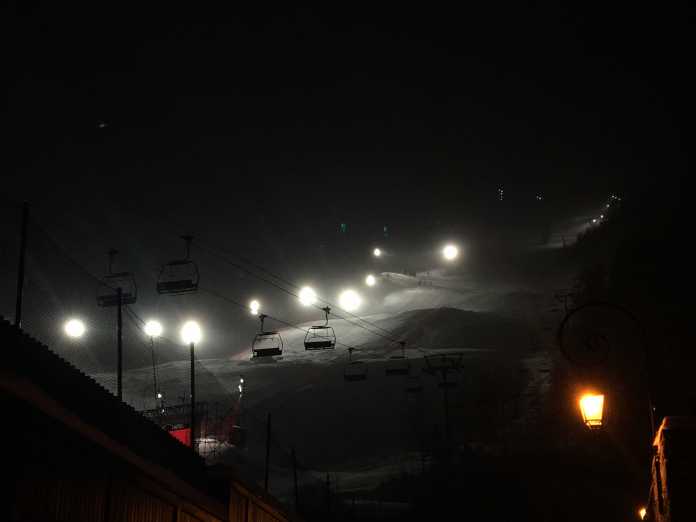 LAVORO NOTTURNO – La Face de Bellevarde è illuminata e la funivia continua a portare in quota gli addetti ai lavori che dovranno pulire la pista dalla neve. È duro, molto duro e pulendo bene la traccia non ci saranno problemi.