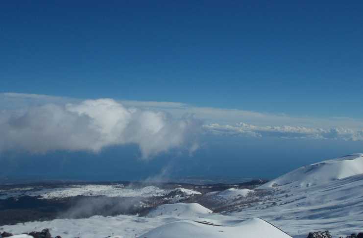Quando ti affacci al cancelletto di partenza vedi la maestosità del Mar Jonio in tutta la sua grandezza e ampiezza indecifrabile. Il cielo finalmente è diventato blu sfavillante. Quelle maledette nuvole se ne sono andate ed hanno permesso, a noi non abitudinari della località, di vedere questo splendido scenario in tutta la sua bellezza. Guardi il mare, vedi Catania, ti accorgi di Taormina, scorgi la Calabria. Ma sei in pista, ad oltre 2000 metri, sulla neve, al vento, oggi a tratti pungente. Un contrasto affascinante, come quella strada che sale da Linguaglossa fino a Piano Provenzana con quel nome che è tutto un (bellissimo) programma. Mareneve. Sei sulla neve, hai davanti il mare, dietro i crateri fumanti del vulcano. Una parola sola, anzi, due: Etna Nord. Si disegnano curve, si accendono speranze, si confrontano ragazze e ragazzi in cerca di gloria nella rassegna del Criterium Interappenninico. Si sogna. Si incamera, si impara, e si ringrazia. E soprattutto, si racconterà. Lo scenario è unico e non capisci bene dove sei quando ti guardi attorno. D’altronde sei ovunque e dappertutto. Come il nome di quella strada che sale da Linguaglossa..Mareneve…